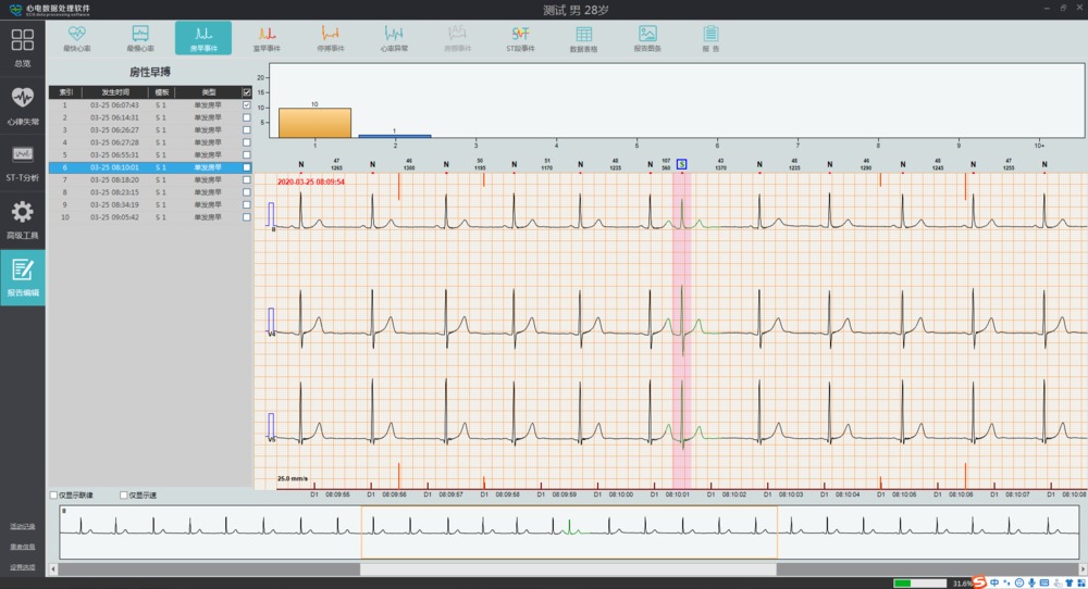 总览界面:将直方图、心率趋势图、时间散点图和可编辑散点图同屏显示,患者情况一目了然