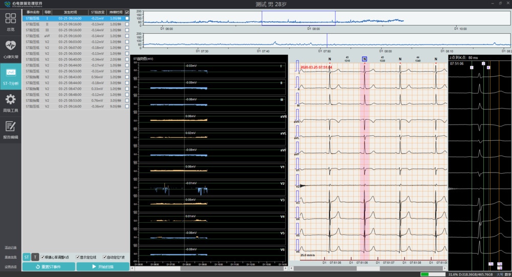 ST-T分析界面:心率趋势图、12导同步心电图、叠加图三位一体同步显示ST-T变化
